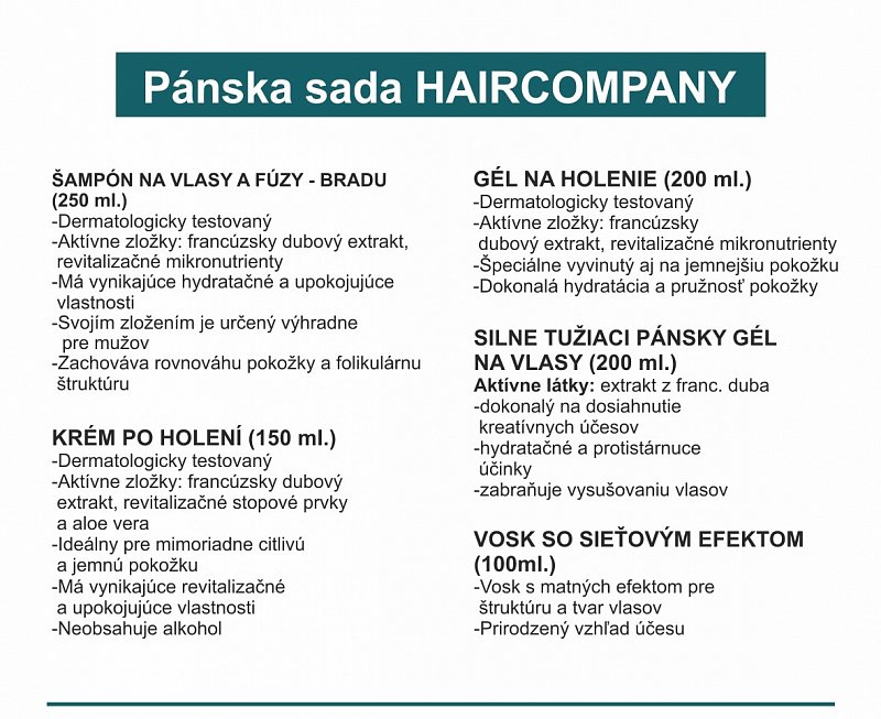 Sada obsahuje: - 1.,Šampón na vlasy, telo a bradu Haircompany (250 ml.) - 2.,Gél na holenie Haircompany (200 ml.) - 3.,Krém po holení Haircompany (150 ml.) - 4.,Vosk so sieťovým efektom Haircompany (100 ml.) - 5.,Silne tužiaci pánsky gél na vlasy Haircompany (200 ml.).