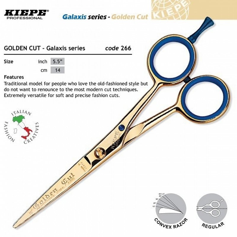 KIEPE TWO STARS Studio style 266/5,5" Golden Cut Galaxis sú profesionálne kadernícke nožnice na kĺzavé strihy. Sú ergonomicky tvarované s opierkou prsta pre lepšiu manipuláciu. Vlastnosti: - vyrobené z nehrdzavejúcej ocele s matnou povrchovou úpravou - pozlátené prevedenie - ergonomický dizajn pre pohodlnú prácu - temperované v zaistenej atmosfére - čepele sú zaoblené systémom "Diamond Sharp" (šikmý systém) na kĺzavé strihy - ergonomický regular (tradičný) tvar Dostupná veľkosť: 5,5´´ - 14 cm Balenie obsahuje: nožnice, olej, odnímateľný podperný uzáver, redukčný krúžok z mäkkej gumy
