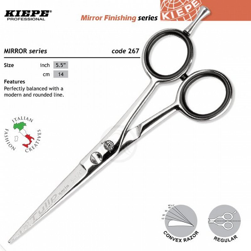 Kiepe Mirror Tulip 267 profesionálne kadernícke nožnice na kĺzavé strihy s leštenou povrchovou úpravou. Vlastnosti: - diamantom brúsené ostrie - regular (tradičný) tvar rukoväti - vyrobené zo špeciálnej uhlíkovej ocele - kalené v ochrannej atmosfére - konkávne vnútorné čepele - leštený povrch Váha produktu: 50 gramov Váha balenia: 83 gramov Dostupná veľkosť: 5,5´´ - 14 cm 6´´ - 16 cm Balenie obsahuje: - 1 ks nožnice - 1 ks odnímateľný podperný uzáver - 1 ks redukčný krúžok z mäkkej gumy