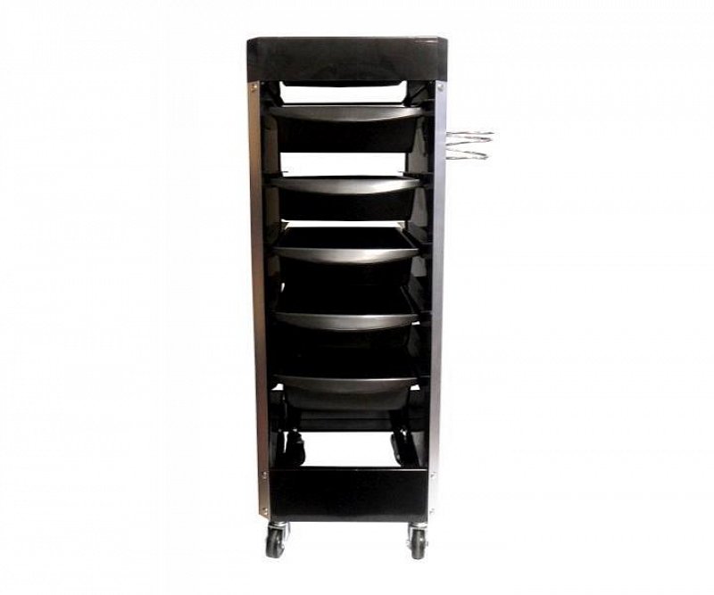 Pracovný kadernícky vozík – VIP má jemný elegantný dizajn, ktorý vytvára pevná hliníková konštrukcia a plastové telo tvorené 5 výsuvnými zásuvkami z oboch strán. Vlastnosti: - 5 pracovných zásuviek z plastu, ktoré môžu byť vysúvané z oboch strán - chrómovaný držiak na fén - telo vozíka je na bokoch lesklé - pevná konštrukcia z hliníka - pojazdné kolieska - rozmer: 87 x 31 x 37 cm
