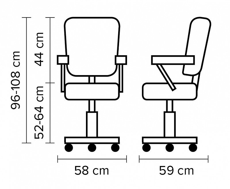 Profesionálne kadernícke kreslo s možnosťou rotácie, s hydraulickou pumpou a nastaviteľnou výška sedenia. Vlastnosti: - moderný dizajn v kombinácií umelej kože a dreva - ľahko udržiavateľné - hydraulická páka - možnosť rotácie - nastaviteľná výška sedadla - drevené podrúčky - chrómový päťlúčový podstavec na kolieskach s brzdou - materiál: umelá koža - nosnosť: max. 200 kg - váha: 30 kg Varianty: Model: 56113 YD29 – čierna umelá koža s podrúčkami: - 21-11 : svetlohnedé drevené podrúčky - 21-12 : hnedé drevené podrúčky - 21-13: čierne drevené podrúčky Rozmery: - stolička (v x š x h): 96 – 108 x 58 x 59 cm - nastaviteľná výška sedadla: 52 - 64 cm - výška sedadla: 44 cm
