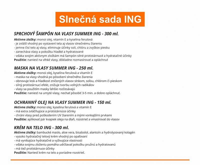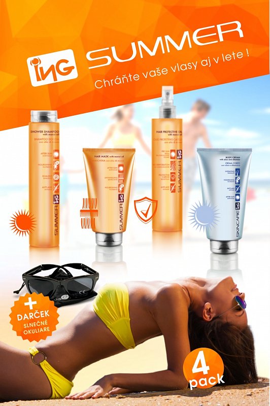 Slnečná rada Summer ING slúži na ochrana vlasov a pokožky. Kozmetika má silné protistárnuce a hydratačné účinky, čím zabezpečuje ochranu pred nežiaducími vonkajšími vplyvmi akým sú slnečné žiarenie, morská voda, chlór a iné.
